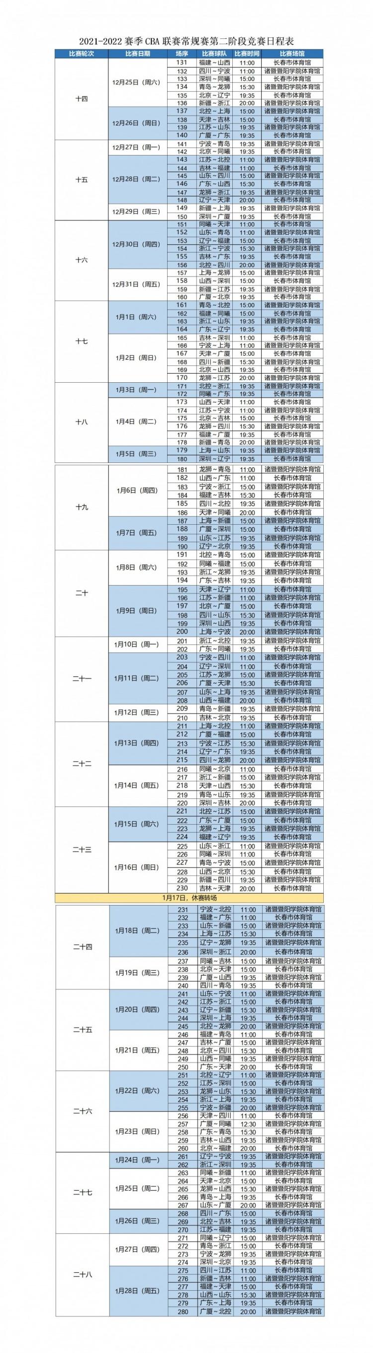 根据上级主管部门批复意见,CBA联赛常规赛第二阶段将于2021年12月25日-2022年1月28日在浙江省诸暨市和吉林省长春市举行。