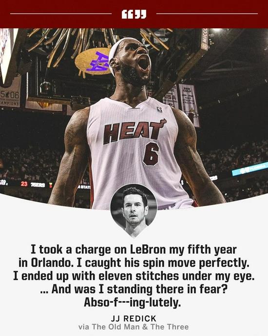 雷迪克表示:“你当然会对球场上的他恐惧,那是来自身体上的恐惧。我在魔术效力时,曾在季后赛对阵詹姆斯,一次我预判到了他会转身,成功造了他进攻犯规,这一下最终让我的眼上缝了11针。”