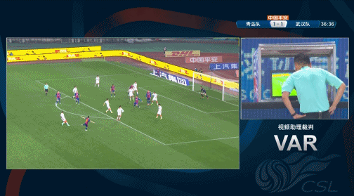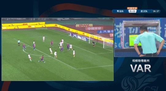 第37分钟,青岛队禁区外一脚射门打到武汉球员杨博宇身上弹出底线,裁判最先判罚角球,但经过VAR裁判提醒回看之后,确认皮球打在了杨博宇手上,裁判改判点球,亚历山德里尼操刀命中,青岛队2-1再度领先。
